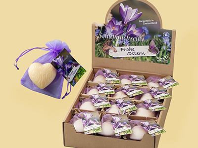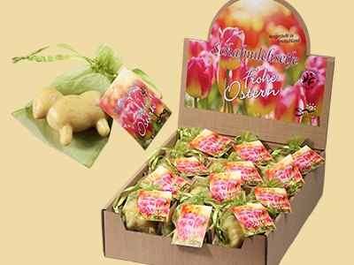 Schafmilchseife Schaf Ringelblume im grünen Organzasäckchen mit Anhänger „Frohe Ostern“