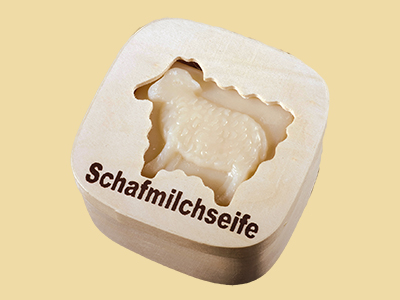 Holzdose mit Schafmilchseife Lamm eckig gefüllt