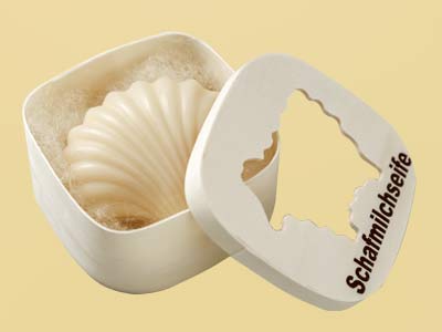 Holzdose mit Schafmilchseife Muschel gefüllt